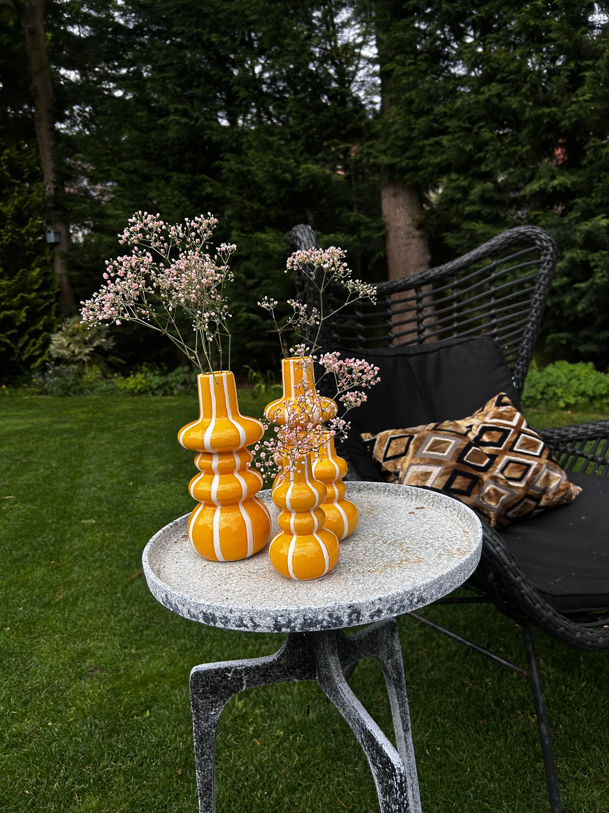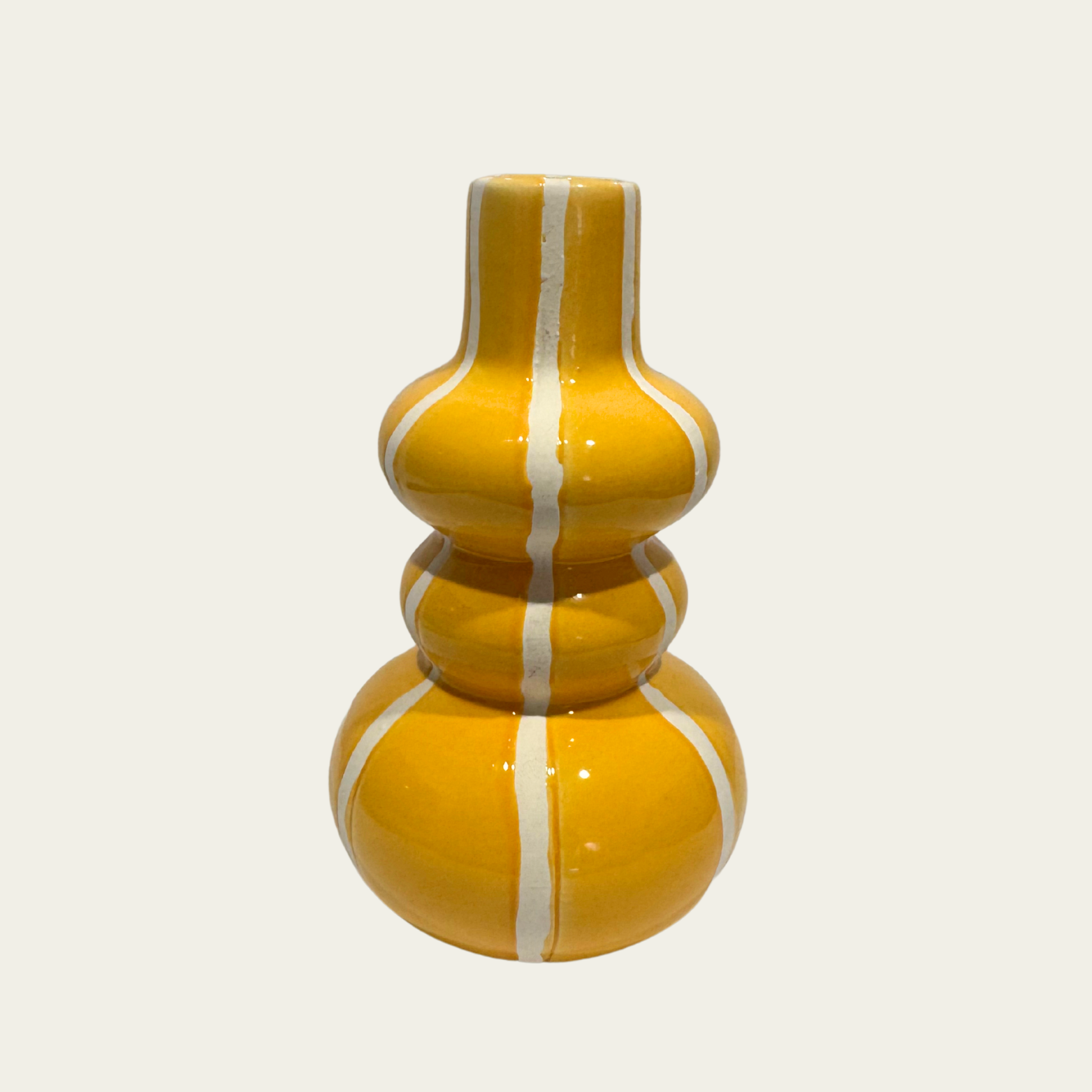 Klein van stuk, groots in uitstraling — De Zonnestraal Mini is het perfecte vaasje voor die ene losgeplukte bloem, een paar gedroogde stengels of gewoon als vrolijke blikvanger op je ontbijttafel. Met haar ronde buikje en zonnige strepen brengt ze direct een glimlach.