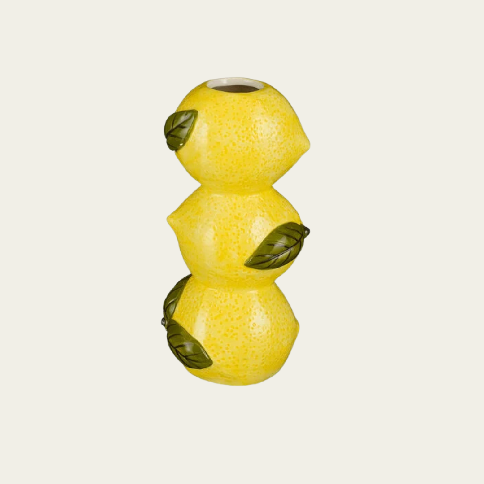 De Citroentoren is een vrolijk kunstwerkje op zich. Drie handgevormde citroenen vormen samen deze speelse vaas die je tafel in één klap zomers laat aanvoelen. Zet er een paar luchtige takken gipskruid of veldbloemen in – of laat ‘m gewoon shinen als decoratief object.